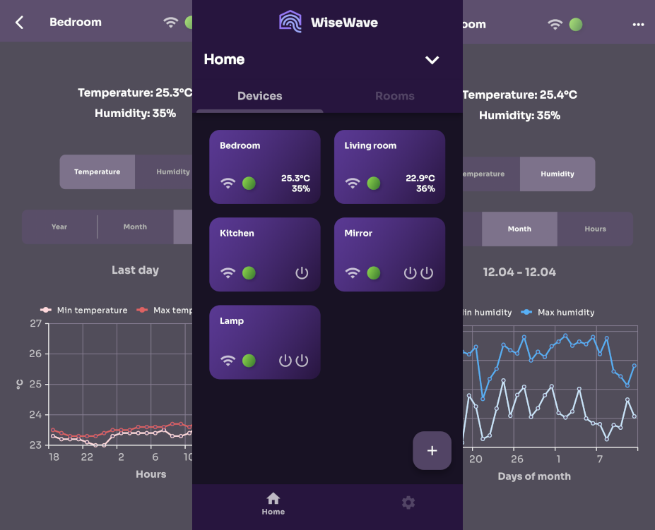 Live measurements as well as hourly, daily, and monthly statistics stored on the device